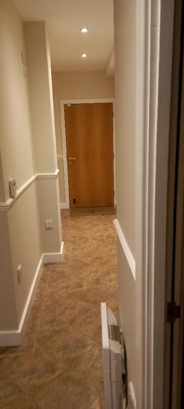 We had purchased a well proportioned apartment, contained within a building originally built as a Depository in the early 1800's, comprising of lounge, diner, kitchen, two double bedrooms, two bathrooms and long hallway. Both bathrooms were completely gutted, new porcelain tiled walls and floors with fitted sanitary wear, showers and accessory furniture. The kitchen was rehashed involving installation of white goods, plumbing, water softener, filters and retiling. The whole of the apartment was prepared and decorated to a high standard. The hall, Sam suggested, would look classy with a fitted dado rail on all walls. An excellent decision!